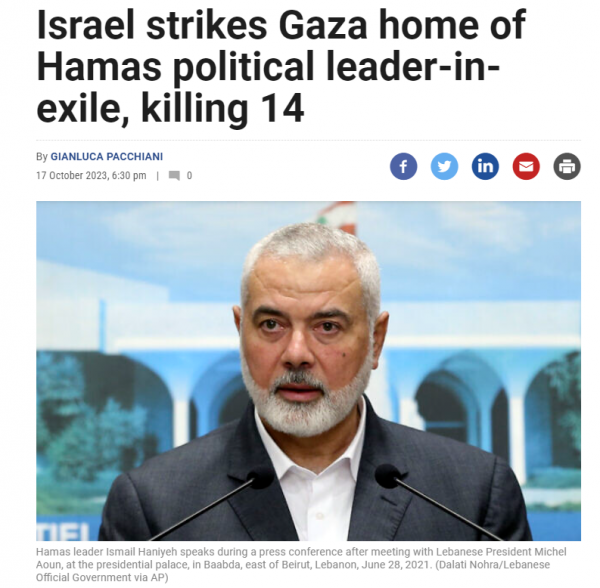 10月17日,《以色列时报》报道称,伊斯梅尔·哈尼亚现居卡塔尔。