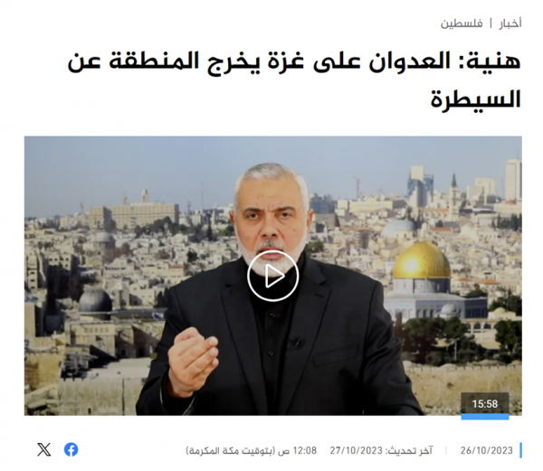 半岛电视台在10月26日报道了哈尼亚的电视讲话。