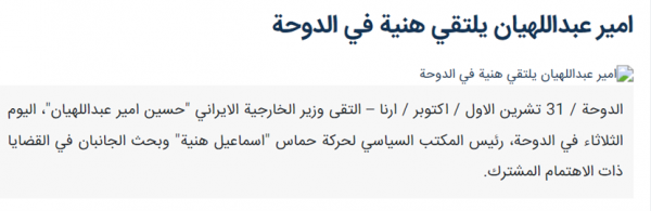 10月31日,伊朗伊斯兰共和国通讯社(IRNA)发布消息称,伊朗外交部长侯赛因·阿米尔·阿卜杜拉希安(Hossein Amir Abdollahian)于31日当天,在卡塔尔首都多哈会见了伊斯梅尔·哈尼亚。