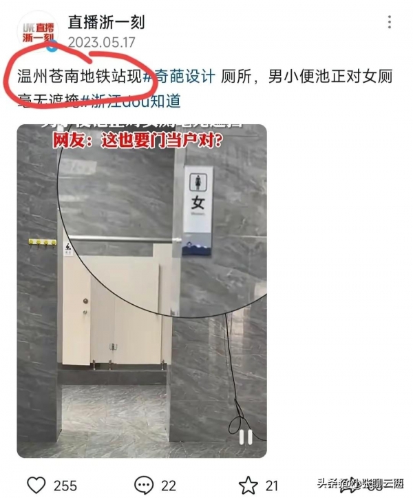 2023年5月,温州苍南地铁站,被曝男小便池正对女厕所,毫无遮拦。