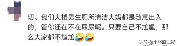 切,我们大楼男生厕所清洁大妈都是随意出入的,管你还在不在尿尿呢。只要自己不尴尬,那么大家都不尴尬!