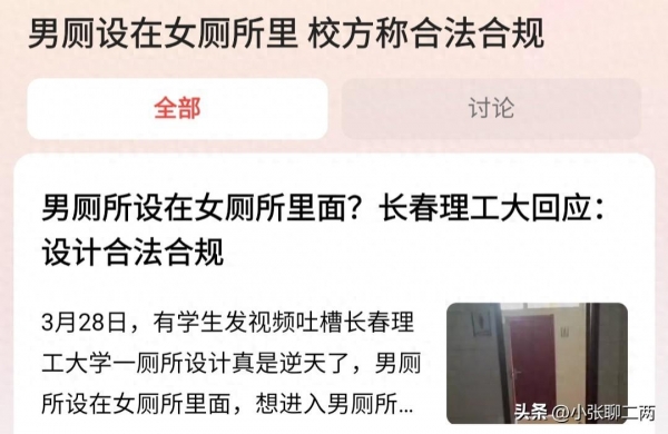 3月28日,长春理工大学的一位网友发视频爆料说"我们学校的这个厕所是真的逆天,想进入男厕所必须先进入女厕所!"