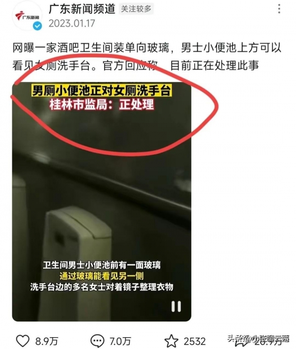2023年1月,桂林网友爆料一网吧卫生间装单向玻璃,男士小便池可以直接看到女厕洗手台,洗手台边多名女士正在对着镜子整衣物。