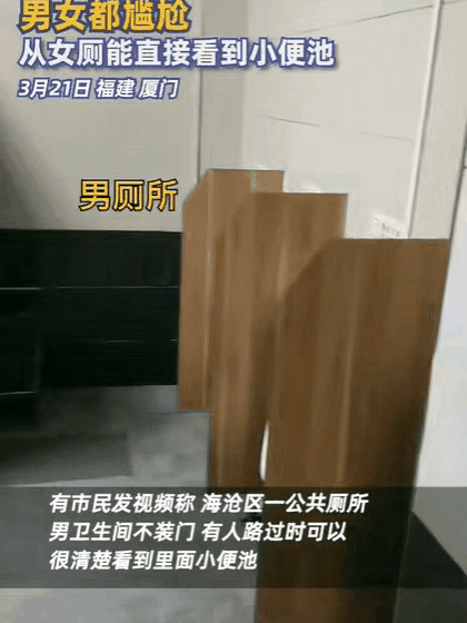 2024年3月21日,福建厦门海沧区一居民反映男卫生间不装门,对面正对着女厕第一间,奇葩的是女厕第一间也没装门,这是干什么?让她们大眼瞪小眼么?