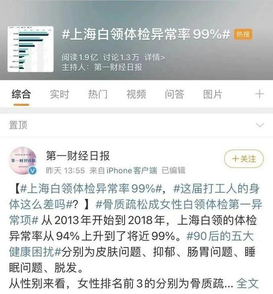 根据《大众医学》发布的《2019上海白领健康指数报告》显示,上海白领体检异常比率高达98.75%。也就是说,100位打工人当中只有不到2人指标完全ok。