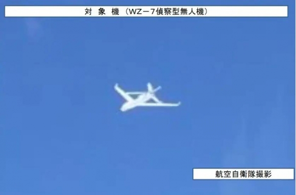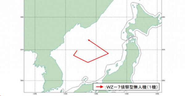 据日本防卫省统合幕僚监部发布消息,在日本海空域发现一架中国的无侦-7(WZ-7)无人侦察机,这是日本防卫省首次公布中国无人机在日本海飞行,而这架WZ-7无人机由中国方向飞向日本海,在日本海上空盘旋转向后,朝着西北方向飞走。日本航空自卫队出动战机,对中国WZ-7无人机进行跟踪监视。