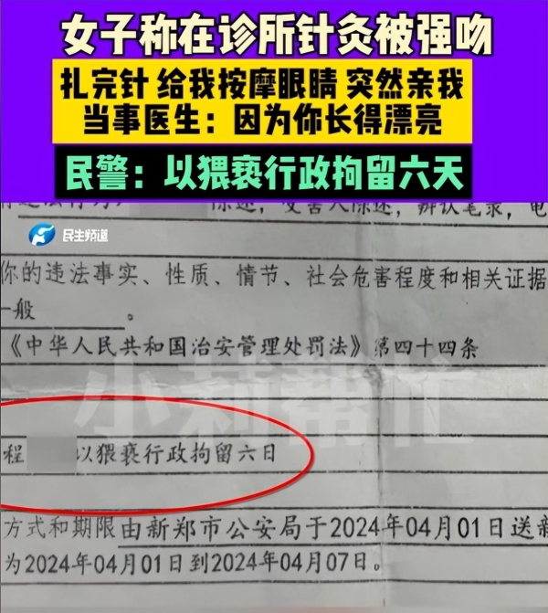 据相关报道称 ,事发于4月1日,在新郑的一家中医诊所内,当事人小娟正在进行针灸治疗。当时,这位医生的老婆不在家,房间里就小娟和医生两个人,医生在给小娟扎完腿、脚、还有肚子的时候,再次进入小娟的房间。