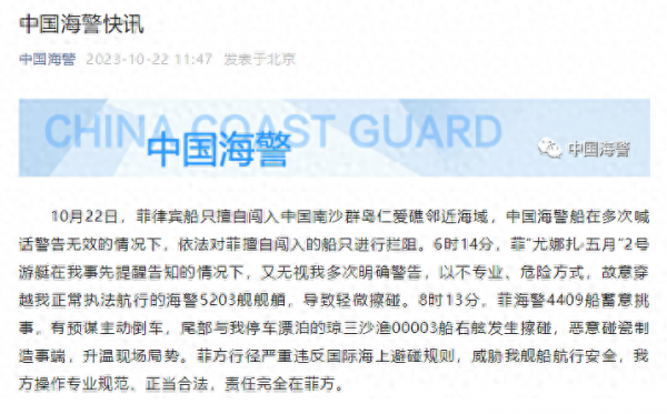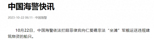但是菲律宾并不领情。10月22日,中国海警再次拦截了企图向非法坐滩仁爱礁的马德雷山号运输建材的菲律宾船只。