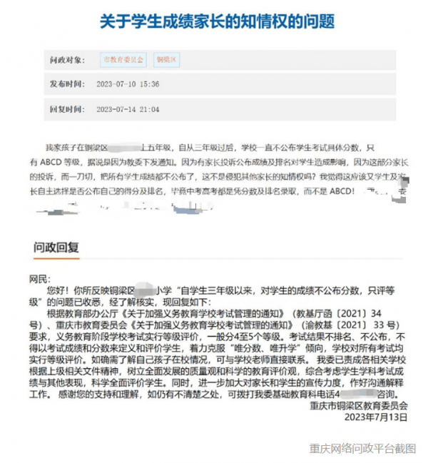 7月10日,重庆市铜梁区一位家长表示,其孩子在铜梁区某小学上五年级,自从三年级过后,学校一直未公布学生考试具体分数,只有 ABCD 等级。该家长表示,希望教委能让家长和学生自主选择是否公开自己成绩,而不是一刀切全部不予公布,毕竟中考高考都是凭分数及排名录取。另外一位家长也反映,公布具体成绩便于家长和孩子更好的查缺补漏。