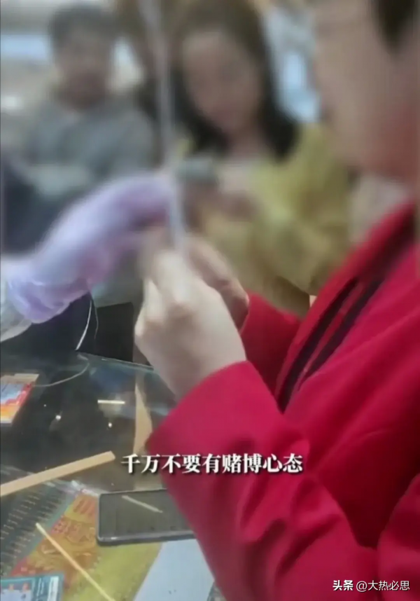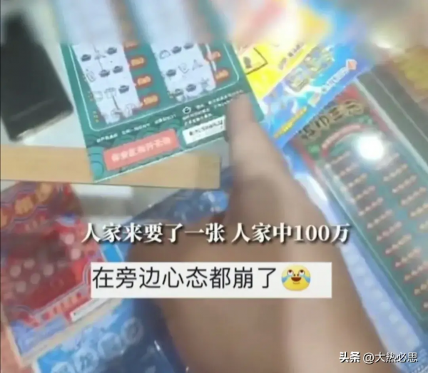 正在拆包装时,旁边来了一女的,买了两张,店员随手从该男子选的票里拿两张给她,谁知,一刮就中100万。