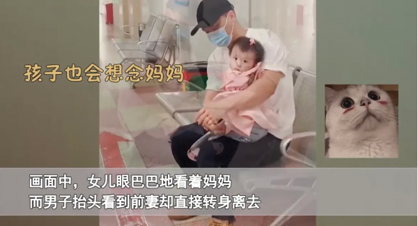 有一段时间没有看到妈妈了,女儿看到妈妈的时候特别兴奋,眼里放光,伸出手要妈妈抱。但是前夫却很冷漠,看了女子一眼后,把女儿扛在肩上直接就离开了。前夫眼神里,满是对前妻的不屑一顾。