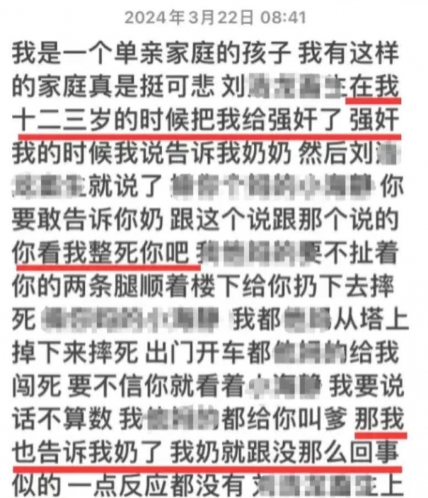 刘海静接着称,随后,她的父亲又多次强奸、猥亵她,导致她幼小的心灵受到了极大的伤害。当时,她也曾经声称要把父亲强奸她的事情告诉奶奶,但她的父亲却威胁她说:"如果敢出去瞎说说,就会想办法弄死你,或者从楼上把你扔下去摔死,亦或者开车撞死你!"基于父亲的威胁,她对父亲强奸她的事情隐忍了好久。