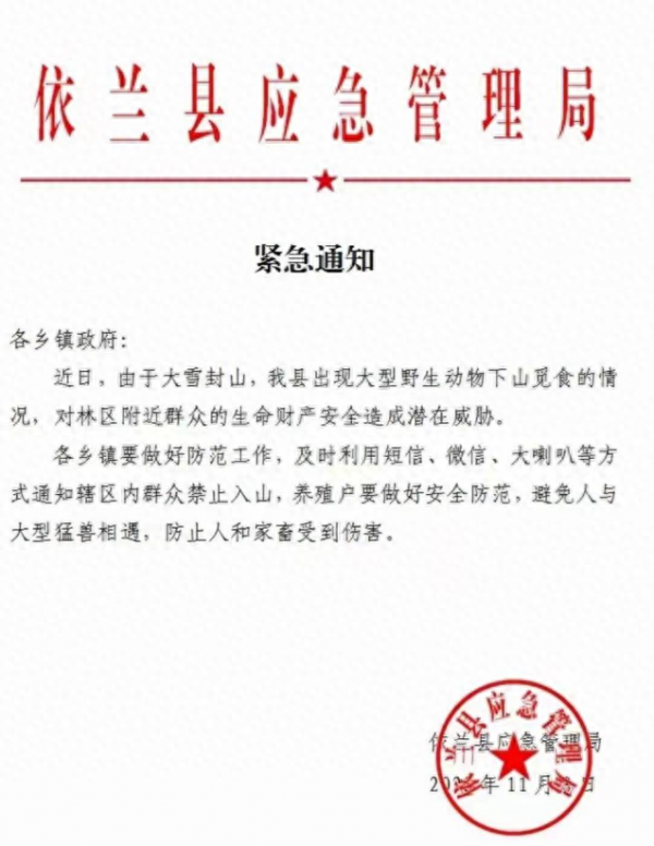 此事件引发依兰县应急管理局于11月8日向各乡镇发出紧急通知。通知指出,近期因大雪封山,县内出现大型野生动物下山觅食的情况,可能对林区附近居民的生命和财产安全构成潜在威胁。各乡镇应加强防范工作,利用短信、微信、喇叭等方式及时通知居民禁止进山,养殖户要加强安全防范,避免与大型猛兽相遇,防止人畜受伤。