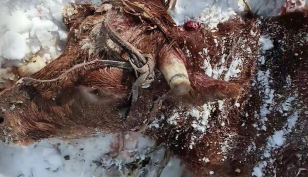 视频显示,一头牛倒在雪地中,臀部和大腿部位有明显的动物撕咬痕迹,旁边还有类似虎爪印的大型动物足迹。