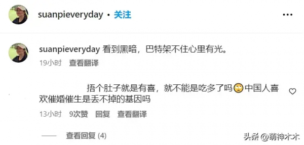 网友的推理显然不够分量,毕竟,仅靠一个动作很难断定徐静蕾的身体状态。而且,徐静蕾的配文也很有趣,"看到黑暗,但心里有光",不知是否针对坊间的怀孕传闻,也有网友在线反驳"催生"派,直言不应胡乱猜测,"捂着肚子"未必是有喜,很有可能是消化不良。