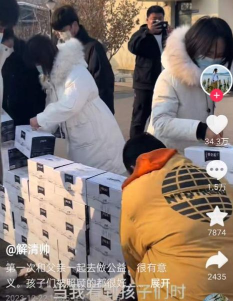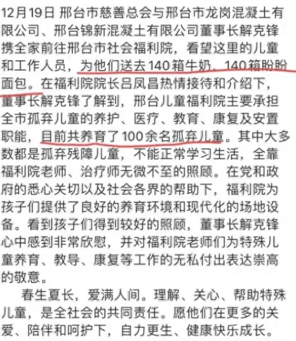 前不久,解克锋还带着全家人一起做公益,为邢台某儿童福利院捐赠了上万元的物资。