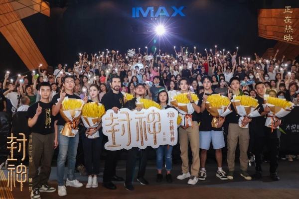 于适、陈牧驰、侯雯元、黄曦彦现场"比心",一边重述角色台词,一边用射箭动作将"心"发射给观众。此外,于适、陈牧驰不仅应邀重现了电影中姬发背殷郊的桥段,两人在现场观众的加油声中相互背起对方绕圈,更重现了殷郊被捆绑的名场面。导演乌尔善介绍,这个捆绑设计类似廉颇向蔺相如负荆请罪,殷郊肉袒面缚的举动,在古代同样是代表一种请罪的诚意。