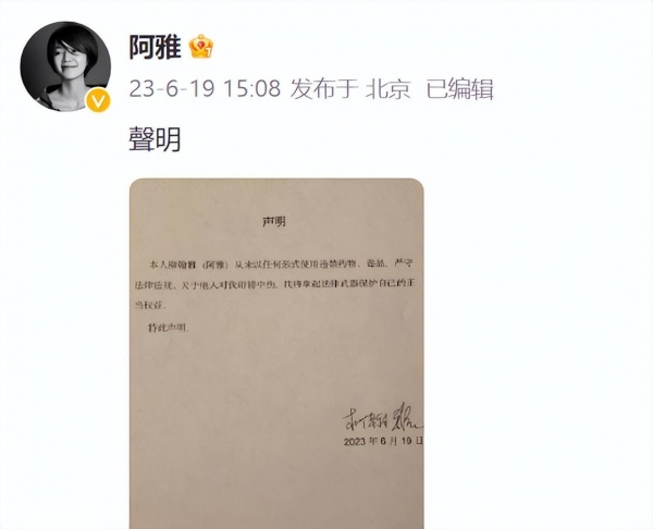 和大小S一起遭到指控的女星阿雅通过本人账号发布声明,否认涉毒嗑药,也提到了会拿起法律武器保护自己,声明上还有本人亲笔签名。
