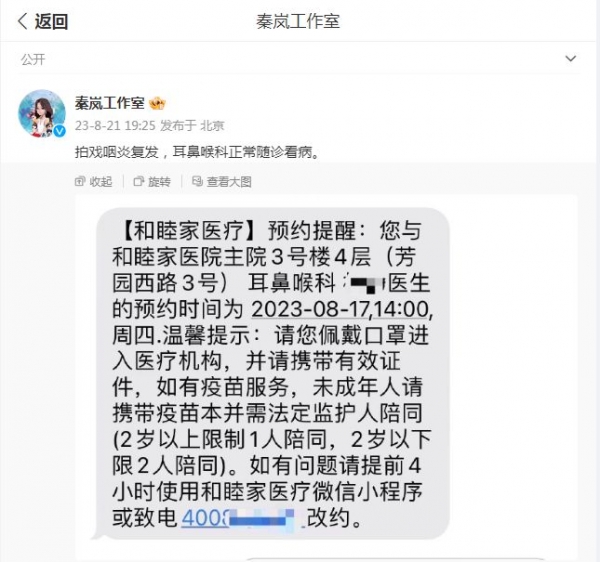 8月21日晚,秦岚工作室突然在社交平台上晒出了一张短信的截图,并为此配文:"拍戏咽炎复发,耳鼻喉科正常随诊看病。"一时间也受到了网友们的广泛关注。从秦岚工作室晒出的截图中也可以看到,她确实是前往了耳鼻喉科就诊,而且上面还明确标准了时间地点。