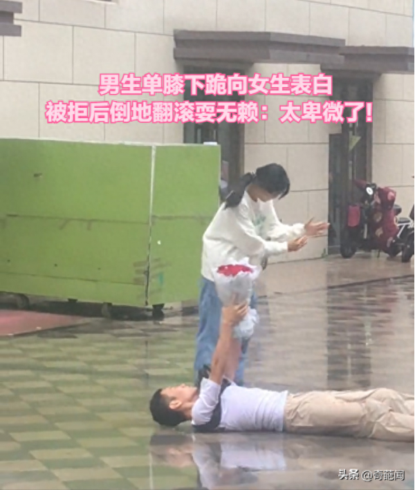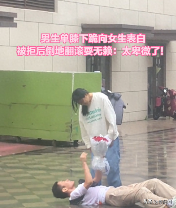 随后女生试图解释并想拉着他起来,然而男生却又重新拿起鲜花举过头顶表示:"你同意了我就起来",这种荒诞可笑的举动让来来往往的路人看到后顿时哭笑不得感慨道:"卑微的爱情伤人又伤己"。