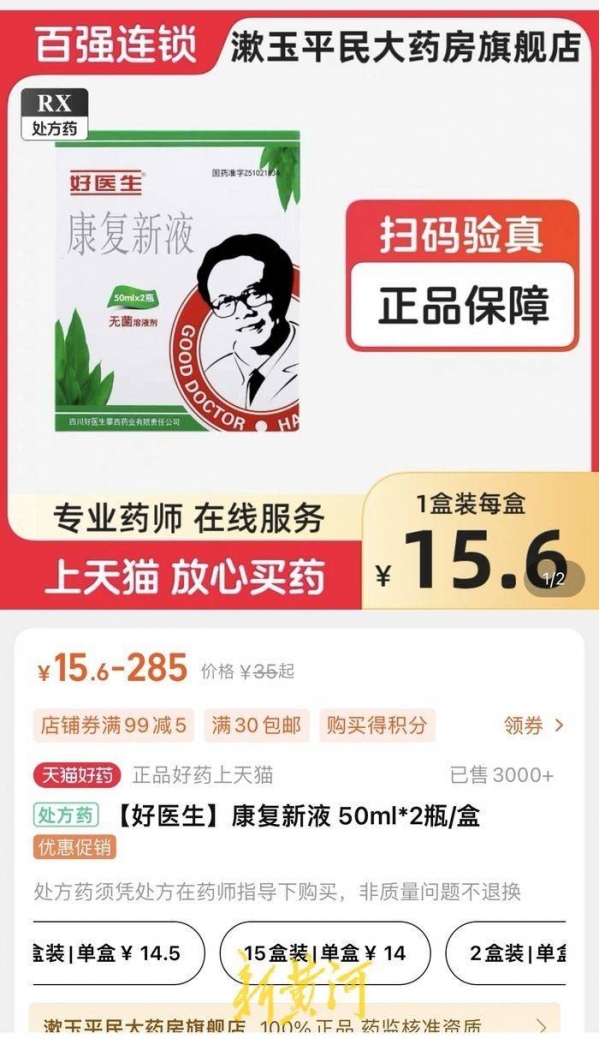 天猫好药平台好医生牌50ml康复新液单盒售价15.6元