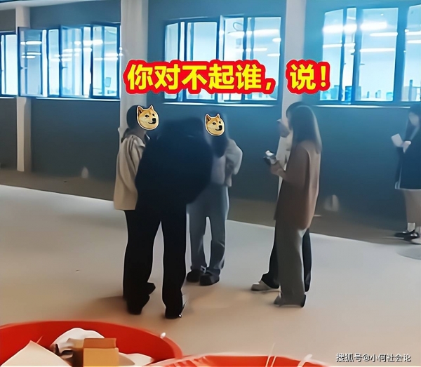 在视频中,一男生与4名女生站在一起,他低着头向她们挨个道歉求原谅,态度表现得十分诚恳。