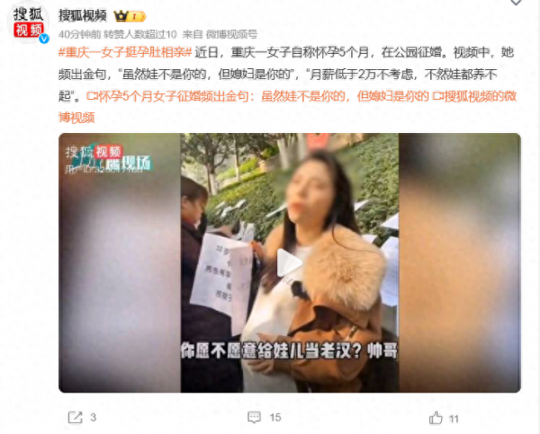 近日,重庆一女子自称怀孕5个月,在公园征婚。视频中,她频出金句,"虽然娃不是你的,但媳妇是你的","月薪低于2万不考虑,不然娃都养不起"。