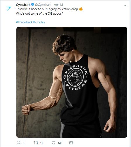 在 Facebook 上,Gymshark 的帖子总是非常简短,并且会在每个帖子中包含标签#gymshark;而与 Facebook 不同的是,Gymshark 在 Twitter 的帖子会使用不同的标签,例如:#MondayMotivation/#TuesdayThought/#ThrowbackThursday,然后给每个帖子附上高度相关的图片或视频。
