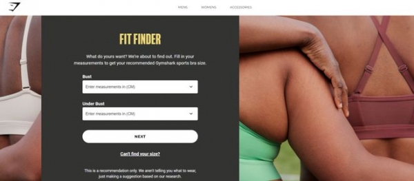 Gymshark 为了帮女性客户找到合适他们的运动背心,在网站上设置了 Sports Bra Fit Finder 互动元素,消费者可以输入自己的上下胸围尺寸,系统会自动推荐合适的尺码,让购物者在选购货物时更加安心,不必担心因为尺码不合而导致的退货问题。