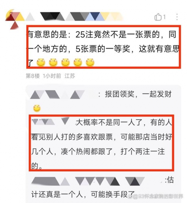 对此网友也是各抒己见,当然大部分人表示分开投注的现象并不少见,没什么值得好奇的。不过也有人表示了不同的看法,他们觉得大概率中奖者不是同一个人,而是有的彩民看到别人打票选择跟票,凑热闹打了1注2注的,因此25注一等奖才分散在5张彩票上。