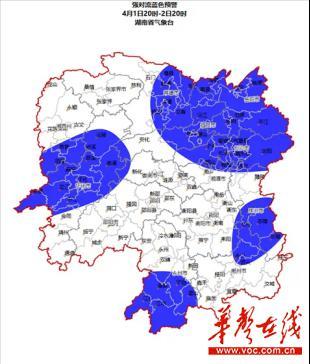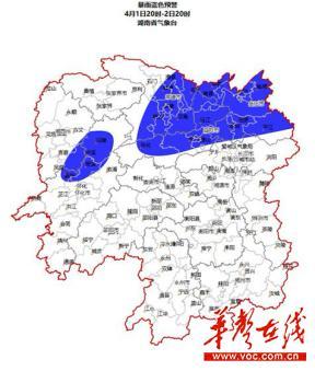 蓝色预警区域:云溪区大部、岳阳县大部、湘阴县东部、平江县、汨罗市大部、临湘市,望城区北部、长沙县北部、浏阳市东部。