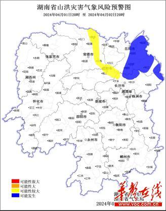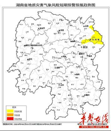 根据地质灾害成灾规律和孕灾条件,结合2024年4月1日短期气象预报情况,省自然资源厅与省气象局联合会商得出如下结论:自4月1日20:00至2日20:00,受降雨影响,湘东北部分区域发生突发性地质灾害风险较高(黄色预警)。