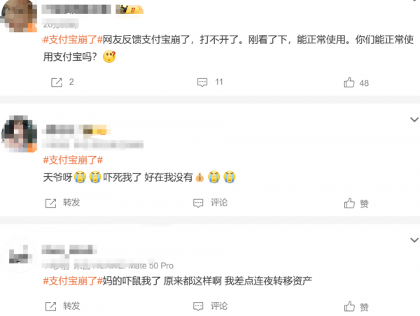对此,不少网友发表评论:"网友反馈支付宝崩了,打不开了。""刚看了下,能正常使用。你们能正常使用支付宝吗?""吓死我了,好在我没有。""崩了可以不用还花呗吗。"