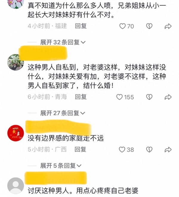 还有网友说,哥哥对妹妹好,确实应该。但是也要顾及妻子的感受。毕竟女人天生都爱吃醋,作为妻子,丈夫对别的异性好,肯定会吃醋,就算这个人是小姑子,也不可以。