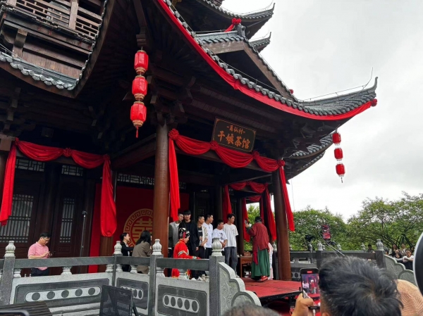 4月17日13时许,九派新闻来到《王婆说媒》现场,舞台位于葛仙村核心位置,宽阔且气派,两旁用大红绸缎装饰,上方挂着"干娘茶馆"标志性牌匾,前方的空地被划分成直播区、互动区和观众区等区域。