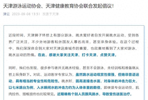 近段时间,天津狮子林桥上有部分游泳、跳水爱好者自发开展跳水运动,受到各界广泛关注,不少外地游客和外国友人慕名而来,甚至亲身体验。在这个过程中,我们深深体会到大家对天津这座城市的喜爱,也欣喜地看到了大家对游泳、跳水运动的热情。在此,感谢大家关注天津、打卡天津、点赞天津。