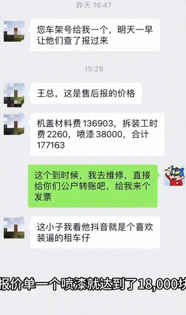 王先生在视频中称,自己已经收到了4S店的维修报价,单一个喷漆就18000元,加上维修费用整个费用17万多接近18万。