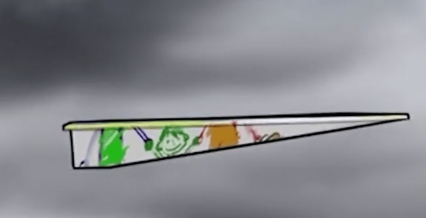 男孩将画像折成一架纸飞机掷向天空,纸飞机变成了一架无人机,逐渐融入空中舰队中。