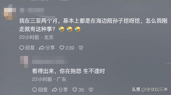 还有网友表示,自己在三亚两个月了,每天都是陪着自己的孙子在海滩上挖沙子,咋我刚走就有着事了?下面网友也是直接戳穿了他的心思,说你这言语中怎么满满的都是遗憾。