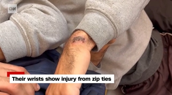 刚获释的这些巴勒斯坦人都没脱下在拘留中心穿着的灰色囚服,并展示了手腕被勒出的伤口,每道伤痕都很深。