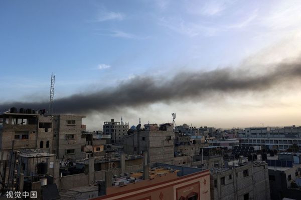 当地时间2024年5月10日,以色列在加沙地带南部的拉法进行轰炸后,日出时建筑物上方升起烟雾。(图源:视觉中国)