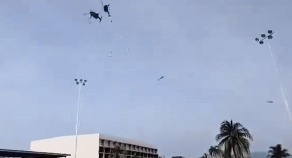 从当地媒体发布的视频画面看,其中一架直升机和另一架直升机的旋翼拍打在了一起,然后两架直升机坠落地面。一架直升机坠到了运动跑道上,一架坠在了泳池附近。从撞机画面上看,这两架直升机在相撞之后基本完全失控,不可能再有有效操控的空间。