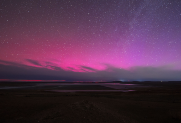 2024年5月11日凌晨,随着太阳强耀斑的再次爆发,内蒙古锡林浩特市上空出现绚丽的洋红色极光。(图片来源:视觉中国)