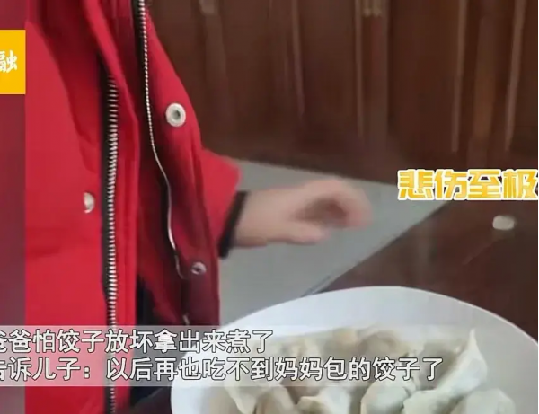 在视频中,父亲对儿子说:"快吃吧!以后再也吃不到妈妈包的饺子了,要懂得珍惜"。听到这句话,儿子一直盯着饺子,一句话没说,最后一个没吃转身走了。他的背影让人感到莫名的难受。