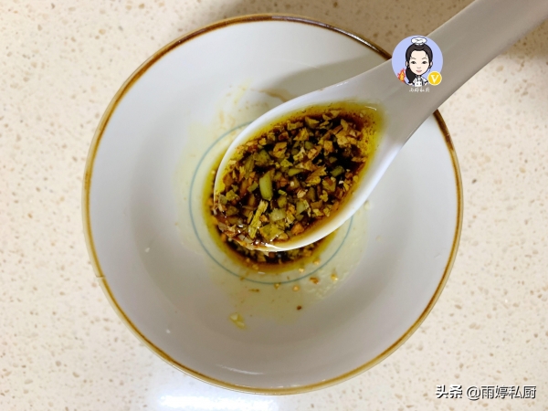 3、制作调味汁时,大蒜末不直接凉拌,而是把蒜末爆香后再加入其它调味汁,可以增加蒜香的同时,还可以减少蒜的燥辣味道。