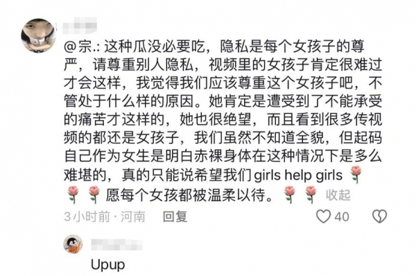 视频里的女孩子肯定很难过才会这样,我觉得我们应该尊重这个女孩子吧,不管出于什么样的原因。她肯定是遭受到了不能承受的痛苦才这样的,她也很绝望。