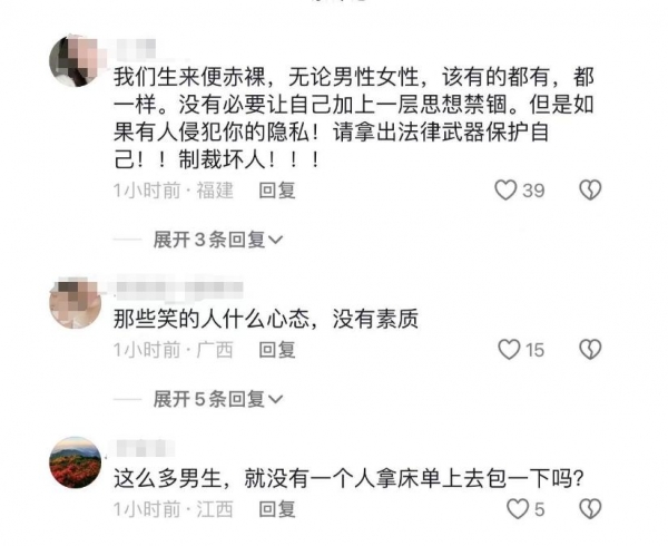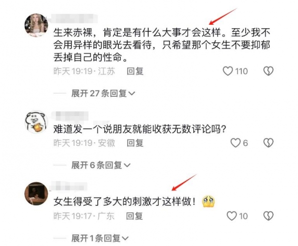 生来赤裸,肯定是有什么大事才会这样。至少我不会用异样的眼光去看待,只希望那个女生不要抑郁!