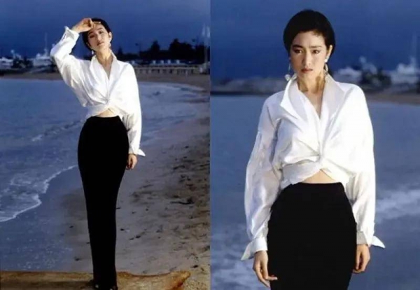 打褶白衬衫加黑裤子,原本是很普通的服装,可穿在巩皇的身上,似乎就变得不一样了。