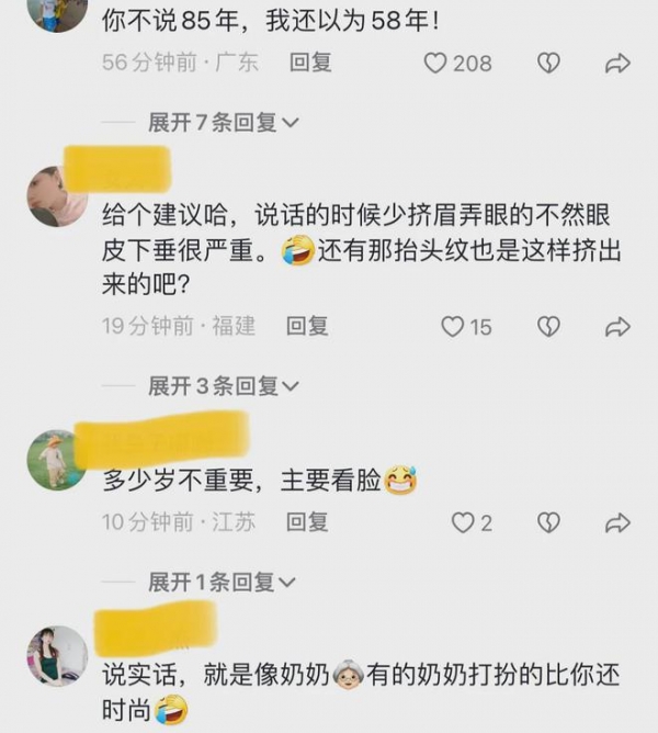 对此,有网友说,你这长相也太着急了吧,85年看上去是假的,58年才是真的,也难怪小朋友把你喊错。有些58年的奶奶打扮起来都比你年轻。