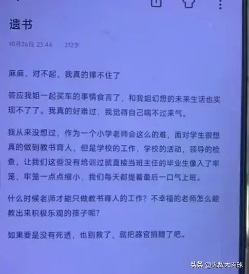 吕某在遗书里面的内容称:麻麻对不起,自己撑不住了,自己从未想到当一个小学老师这么难,虽然她很想教育育人,但是课外的工作,活动,领导的检查让她感觉进入牢笼似的,喘不过气来,每天都提着一口气上班。压力太大导致自己不幸福,怎么教出积极向上的孩子?特别是最后那句没有死透,也别救了。看出来吕某必死之心。